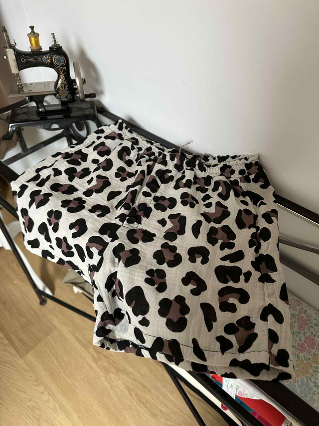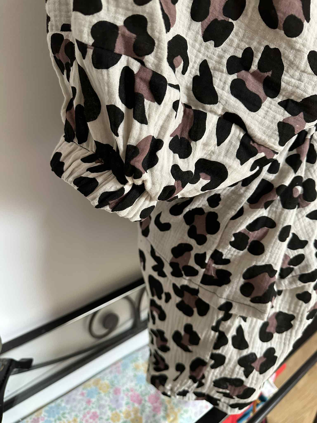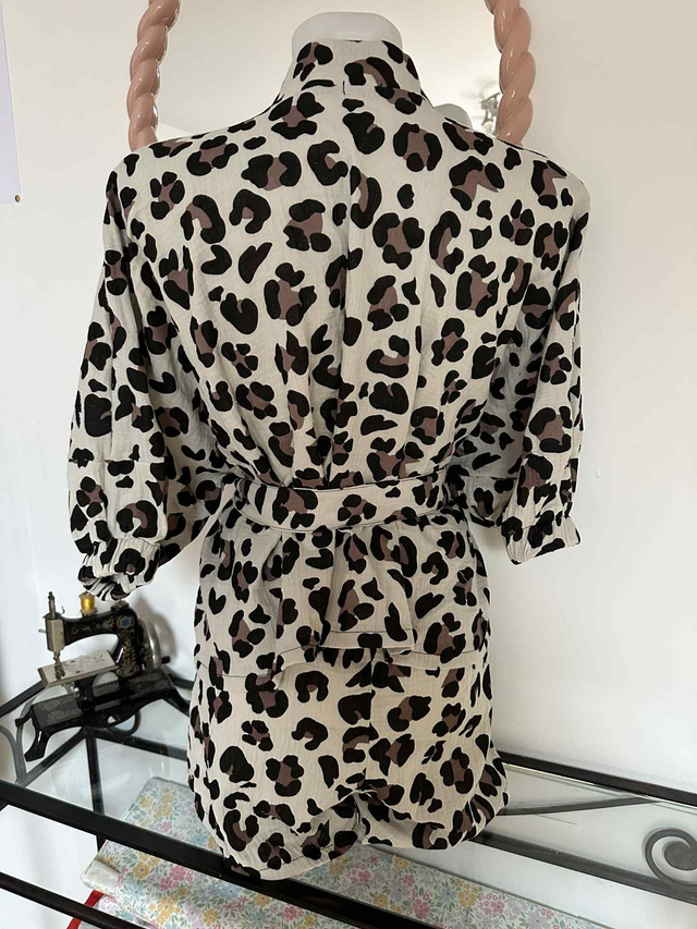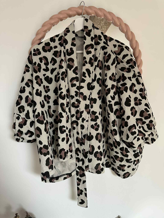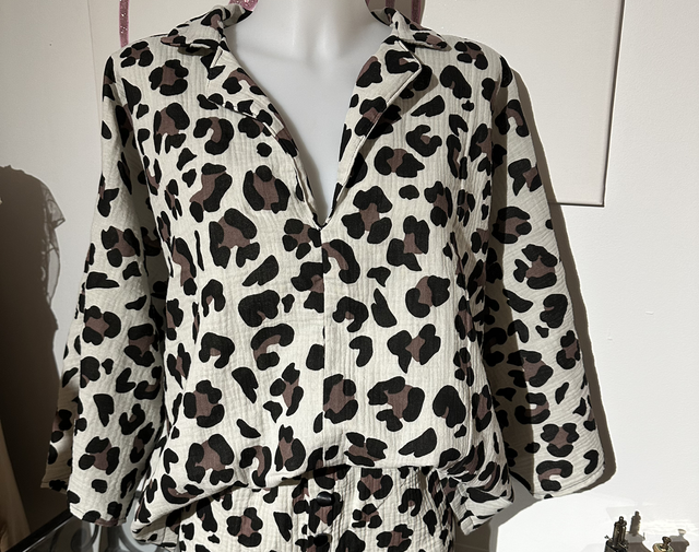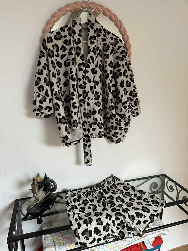 Pyjama au motif léopard, composé de deux pièces (un short et un kimono) en double gaze de coton.
